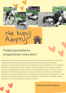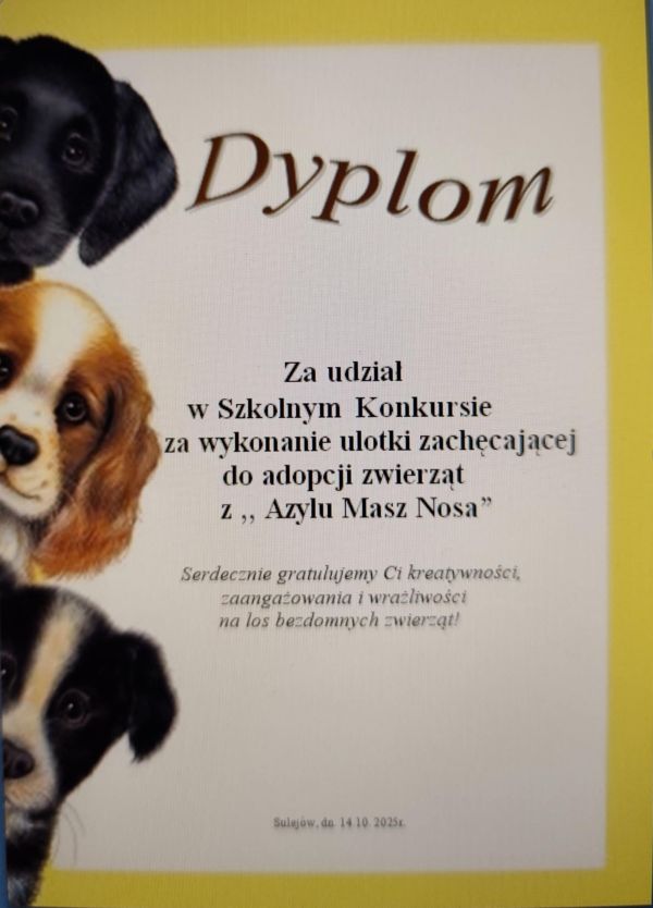 Celem konkursu było promowanie idei adopcji zwierząt, a także rozwijanie umiejętności tworzenia przekazu graficznego i tekstowego o charakterze społecznym. Powstały prace pełne serca, ciekawych haseł i pięknych ilustracji – każda z nich pokazała, że nasi uczniowie potrafią mówić o ważnych sprawach z prawdziwym zaangażowaniem.