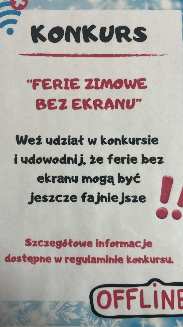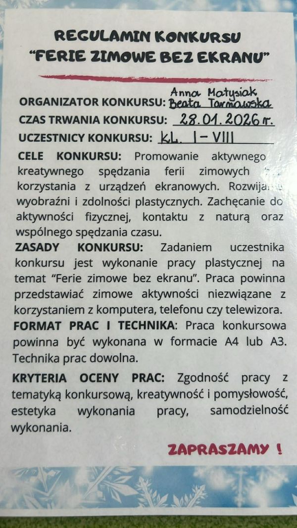 Serdecznie zapraszamy uczniów klas I–VIII do udziału w konkursie plastycznym „Ferie zimowe bez ekranu”. Celem konkursu jest promowanie aktywnego, zdrowego i kreatywnego spędzania ferii zimowych bez korzystania z urządzeń ekranowych. Prace plastyczne należy wykonać w formacie A4 lub A3, dowolną techniką. Termin składania prac upływa 28 stycznia 2026 r. Rozstrzygnięcie konkursu oraz wręczenie nagród odbędzie się podczas apelu podsumowującego 30 stycznia 2026 r. Zachęcamy do udziału!